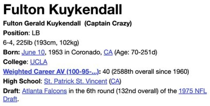 Explore Fulton Kuykendall net worth, age, height, bio, birthday, wiki, and salary! Fulton Kuykendall (born June 10, 1953) is a former NFL football player. He is a graduate from the University of California, Los Angeles who played pro football from 1975–1985 for the Atlanta Falcons. The lanky 6-4 225 lb Kuykendall started primarily at inside linebacker for the Falcons from 1975–1983, making the Pro Football Weekly All-NFC Team in 1978. Nicknamed “Kaptain Krazy” by his teammates, he was known for his apparent disregard for his body, launching himself into opposing blockers and ball carriers with fervor. A Member of the 1977 Atlanta Falcons “Gritz Blitz” defense. Noted for fewest points in a season 129. Also known as one of the top 10 NFL Defenses of All-Time. In this article, we will discover how old is Fulton Kuykendall? Who is Fulton Kuykendall dating now & how much money does Fulton Kuykendall have?