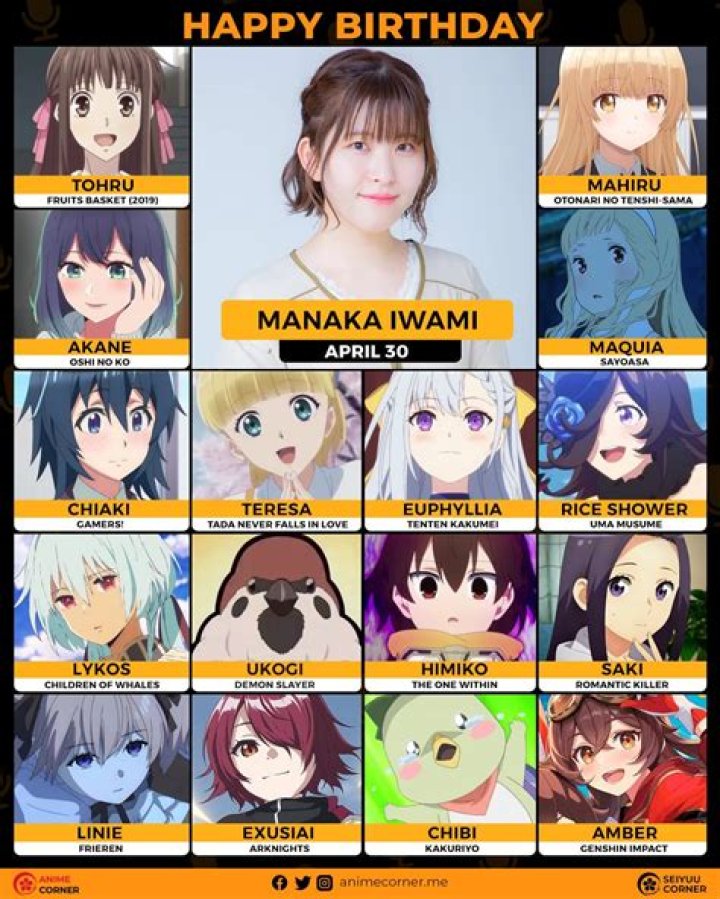 Manaka Ranked on the list of most popular Voice Actress. Also ranked in the elit list of famous people born in Japan. Manaka Iwami celebrates birthday on April 30 of every year.
