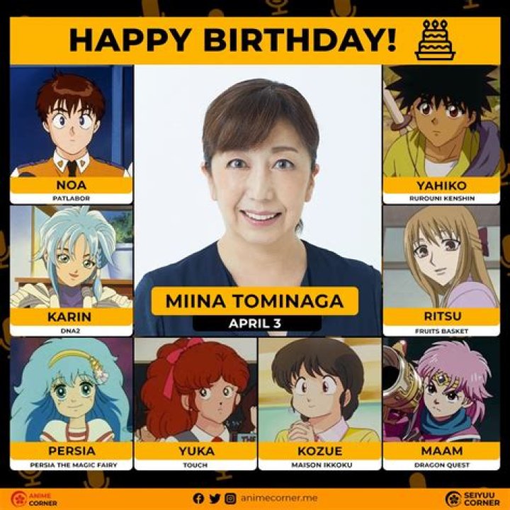 Miina Ranked on the list of most popular Seiyū. Also ranked in the elit list of famous people born in Japan. Miina Tominaga celebrates birthday on April 3 of every year.